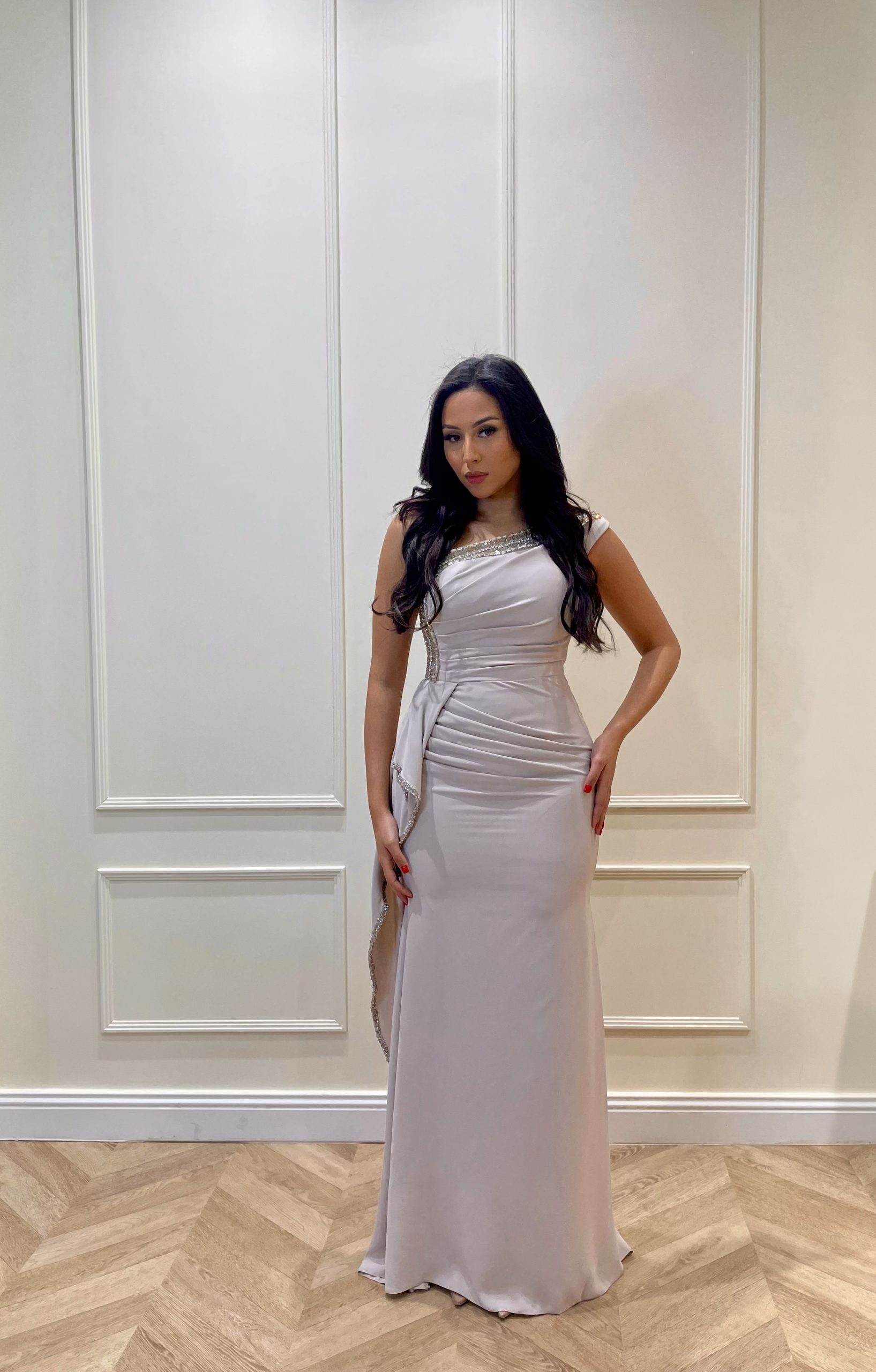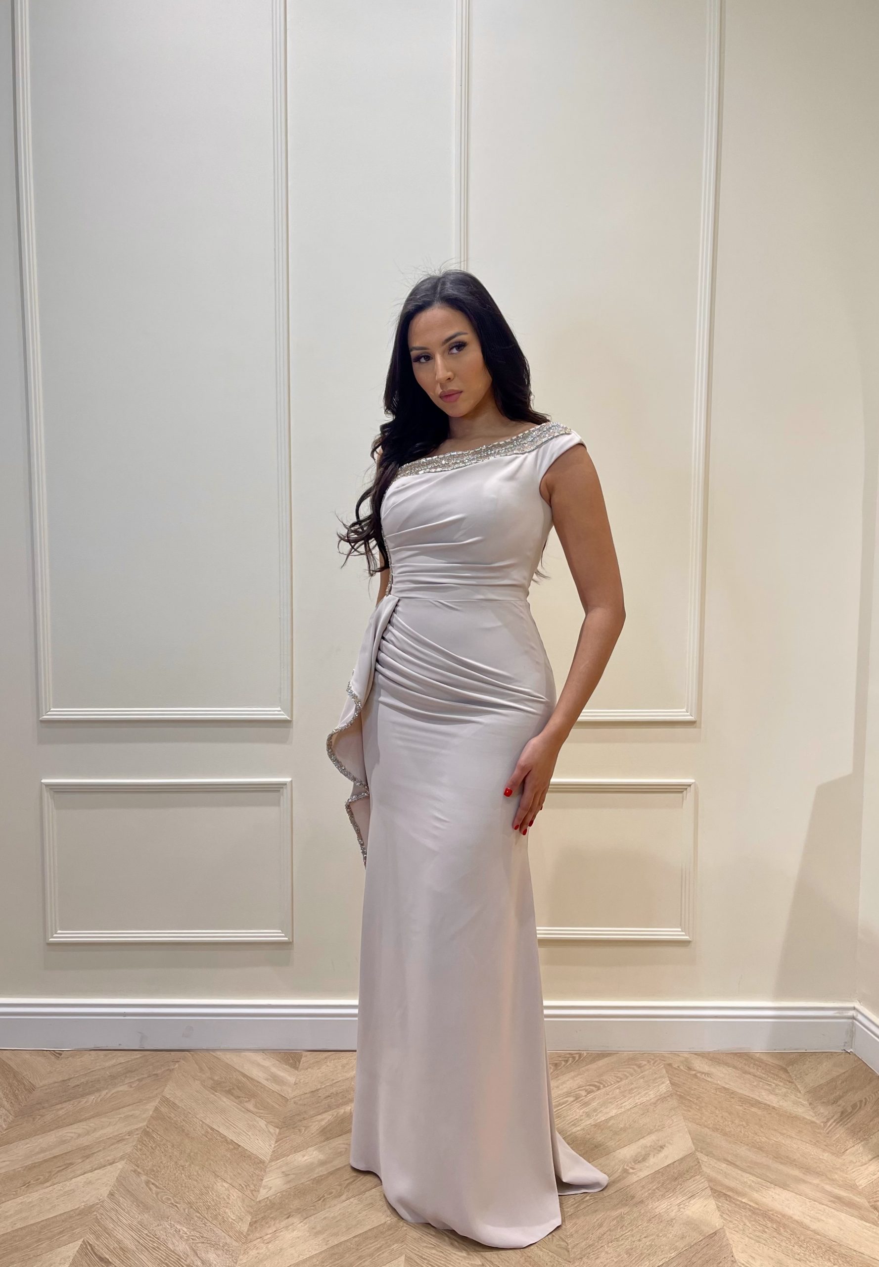 Robe beige en crêpe asymétrique et détail volant sur la hanche